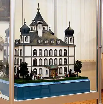 On the location of the old castle in Kärlich, Prince-Elector Karl Kaspar von der Leyen (1618–1676) built a new representative palace between 1654 and 1660.[3][2][1] It was a moated castle constructed in renaissance style.[3][2] The design was by the Franciscan brother Gerhard Mahler.[3] An avid architecture enthusiast, Karl Kaspar also undertook a significant reconstruction of his family castle in Blieskastel.[3]
