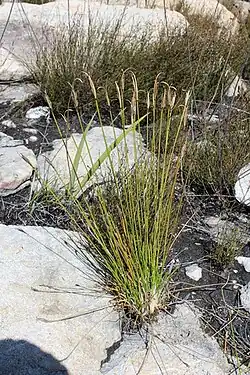 Southern African Schoenus were once classified as Tetraria; however, based on molecular and morphological differences, we now know that the two groups are evolutionary distinct.[7] To ensure that this group of sedges is monophyletic (i.e. the genus only has closely related species), several species of Epischoenus and the southern African Tetraria were transferred into Schoenus.[7] In the field, the southern African Schoenus can be distinguished from Tetraria species by their lack of stem leaves and the absence of reticulate sheaths at the bases of the flowering stems.[7]