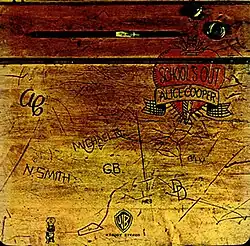 The original album cover (designed by Craig Braun) had the sleeve opening in the manner of a wooden school desk, similar to Thinks: School Stinks, by Hotlegs, released two years earlier. The band members' names appear in the form of graffiti carved into the desk. The vinyl record inside was wrapped in a pair of panties, though this was later discontinued as the paper panties were found to be flammable.[8] The desk photographed for the album cover is on display in the Hard Rock Cafe in Las Vegas.