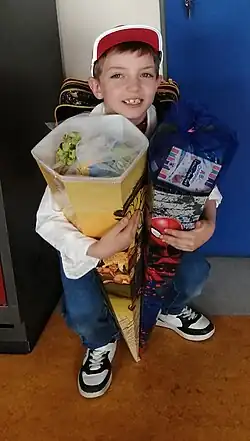 When children in Germany, Austria, German-speaking parts of Switzerland and Belgium, parts of the Czech Republic close to the German border,[1] and parts of Poland (Greater Poland, Upper Silesia, Warmia), set off for their first day of school upon entering first grade, their parents and/or grandparents present them with this large cone, attractively decorated and filled with toys, chocolate, candies/sweets, school supplies, and various other special treats. The cone is given to children to make this anxiously awaited first day of school a little sweeter.
