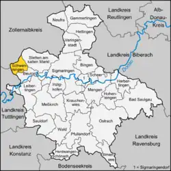 Alb-Donau-KreisBodenseekreisBiberach (district)Konstanz (district)Ravensburg (district)Reutlingen (district)Tuttlingen (district)ZollernalbkreisBad SaulgauBeuronBingenGammertingenHerbertingenHerdwangen-SchönachHettingenHohentengenIllmenseeInzigkofenKrauchenwiesLeibertingenMengenMengenMeßkirchNeufraOstrachPfullendorfSauldorfScheerSchwenningenSigmaringenSigmaringendorfSigmaringendorfStetten am kalten MarktVeringenstadtWald