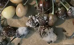 Fruit rot appears as small, circular brown spots that increase rapidly in size causing the entire fruit to rot. Greyish spores appear in tufts on rotted areas.[4] Infected fruit eventually turn into shrivelled, black mummies that may drop or remain attached to the tree through the winter. Brown rot can be serious on injured fruit such as cherries split by rain.[3]