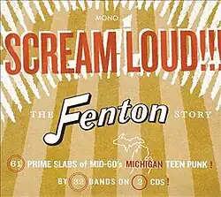 Scream Loud!!! The Fenton Story is a garage rock compilation consisting of songs released by Fenton Records in Grand Rapids, Michigan and the assorted vanity labels that it had pressed and distributed for various regional acts, primarily from western Michigan in the 1960s, and is available on identical LP and CD formats.*[1] The set focuses on basic upbeat and rocking material, but includes a couple of odd and more eclectic expetions.[1] Fenton's founder was musician and entrepreneur Dave Kalmbach, who intended the label to be a place where un-established groups could have a place to record on either the Fenton label itself or on their own vanity labels, which were usually given special custom names chosen by the bands and their management, often under the arrangement that the bands would pay themselves for most of the recording and pressing costs, but receive a certain share in royalties.[1] Commenting on how these recordings more-or-less function as aural snapshots taken from the bygone scrapbook of a more innocent time, Stephen Thomas Earlewine commented:
