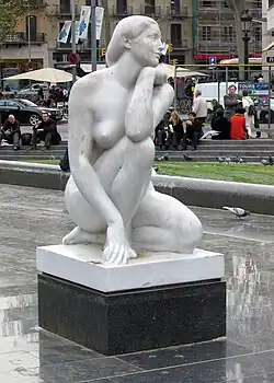 | Goddess | Josep Clarà | Marble | 1,45 x 0,65 x 0,82 | Also known as The Enigma, this work is located in a pond facing the Ramblas and was a direct commission to the author outside of the 1927 competition. In fact, the work was executed according to an original model from 1911. Placed in the square in September 1928, it was strongly criticized by the moralist sectors because it was a nude, so it was removed after three days; however, it was reinstalled on May 19, 1929, one day before the inauguration of the International Exposition, where it remained permanently. The figure represents a sitting nude woman, with one leg with the knee bent on the ground and the other, also bent, raised to the chest, while the left arm rests on the knee of this leg, the hand is placed on the shoulder and the head rests on it. The facial expression is introspective, meditative or doubtful, hence the nickname "enigma". The anatomy of the figure is round, sensual, in full harmony with the Noucentist Mediterraneanism in vogue at the time. It is Clarà's masterpiece, and over time it has become one of the most representative symbols of Barcelona. In 1982 this work was moved to the lobby of the Barcelona City Hall and replaced by a copy by Ricard Sala. In 1991, the Monument to Francesc Macià by Josep Maria Subirachs was placed next to this statue.[40] |