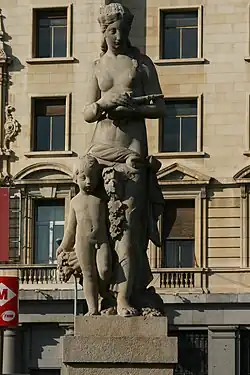 Finally, 28 works were installed: Maternity, by Vicenç Navarro; Young, by Josep Dunyach; The forger, by Josep Llimona; Woman with child and piccolo, by Josep Viladomat; Female Figure, by Enric Casanovas; Youth, by Josep Clarà; Flute Shepherd, by Pablo Gargallo; Navigation, by Eusebi Arnau; Barcelona, by Frederic Marès; Montserrat, by Eusebi Arnau; Female Figure, by Josep Llimona; Hercules, by Antonio Parera; Woman with Angel, by Vicenç Navarro; Tarragona, by Jaume Otero; Fuente de los seis putti, by Jaume Otero; Lérida, by Joan Borrell; Mujer con imagen de la Virgen, by Enric Monjo; El espíritu popular, by Jaume Otero; Pastor del águila, by Pablo Gargallo; Pomona, by Enric Monjo; Wisdom, by Miquel Oslé; The Goddess, by Josep Clarà; Work, by Llucià Oslé; Emporion, by Frederic Marès; Fisherman, by Josep Tenas; Woman, by Joan Borrell; Montseny, by Jaume Duran; and Gerona, by Antonio Parera.[10] Originally there was also in the square the group Niños cabalgando sobre peces (1928), by Frederic Marès, a fountain with water jets and four of the figures indicated in the title, which was moved in 1961 to the intersection of Gran Vía and Rambla de Cataluña.[11]