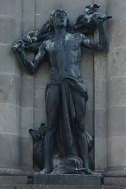 Plaça de Catalunya began to be urbanized in 1902, although the high point of the works took place in the 1920s, with a view to the celebration of the International Exposition. In 1927 a public competition was organized to decorate the square, in which it was decided to install 28 sculptures by artists such as Eusebi Arnau, Joan Borrell, Enric Casanovas, Josep Clarà, Josep Dunyach, Jaume Duran, Pablo Gargallo, Josep Llimona, Frederic Marès, Enric Monjo, Vicenç Navarro, Llucià Oslé, Miquel Oslé, Jaume Otero, Antonio Parera, Josep Tenas and Josep Viladomat.[2] This ensemble is one of the largest in Barcelona in terms of public art, and is an authentic open-air sculpture museum.