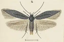 ♂. 10 mm. Head, palpi, thorax dark bluish-slaty-grey. Abdomen grey, ventral surface suffused pale ochreous, anal tuft pale greyish-ochreous. Forewings elongate-lanceolate; dark bluish-slaty-grey; stigmata indicated by hardly perceptible cloudy darker spots only visible in certain lights, plical and first discal transversely placed beyond middle, second discal at ¾; obscure spots of grey-whitish suffusion beneath fold at 1/3 and 2/3 and towards apex: cilia grey. Hindwings grey, paler towards base; cilia grey.[2]