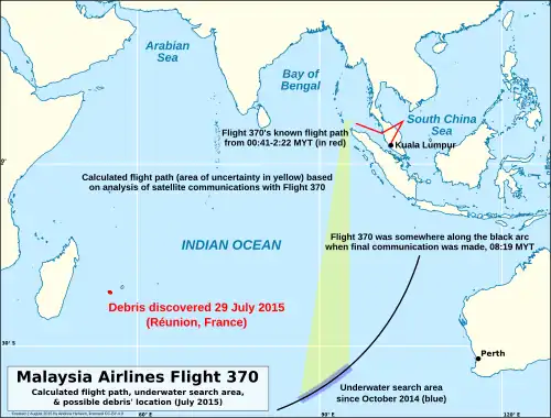 Despite delays, the search of the priority search area was to be completed around May 2015.[3] On 29 July 2015, a piece of marine debris, later confirmed to be a flaperon from Flight 370, was found on Réunion Island.[4][5][6]