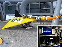 The MV Fugro Supporter and MV Havila Harmony were equipped with a Kongsberg HUGIN 4500 autonomous underwater vehicle (AUV), which carried the same instruments as the towfish deployed by the other vessels. Unlike the towfish, the AUVs were self-propelled and could manoeuvre themselves to maintain a constant altitude above the seafloor. When launched, the torpedo-shaped AUV dived to the proper altitude, then followed a pre-programmed search pattern for up to 24 hours, collecting sonar data for up to 24 hours; when the mission was complete, the AUV surfaced and was recovered by the vessel, where the data was downloaded and the batteries were swapped for the next mission. The AUVs were used to scan areas which could not be effectively searched by the towfish on the other three vessels.[194][202] Because of the difficulty in operating the AUV during the austral winter months due to sea conditions, the AUV operations were suspended during the austral winter months.[208]