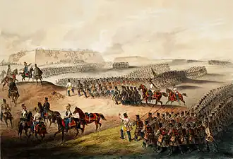 A total of 191 infantry companies and 38 cavalry squadrons (26,796 men, 4,871 riding horses, 1,649 carriage horses and 131 cannons) were commanded by General Artúr Görgei.[1] According to Csikány, Görgei commanded 27,400 men and 134 guns.[33] Nearly one-fourth of the army consisted of cavalry, a high contemporary percentage. Although the Hungarian artillery was supported by the fortress cannons, further from the trenches the Austrian artillery was numerically superior.[33]