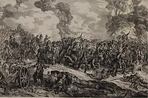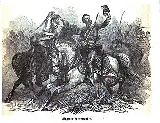 Poeltenberg's troops were retreating in disorder when Görgei and his staff arrived on the right flank, and the commander saw that the Austrians had occupied three Hungarian trenches.[51] He retook the trenches with the 71st battalion, which counterattacked in three columns with bayonets and incurred heavy losses. Lacking support from other Hungarian units and under attack from the Danube, however, they had to retreat again.[52]