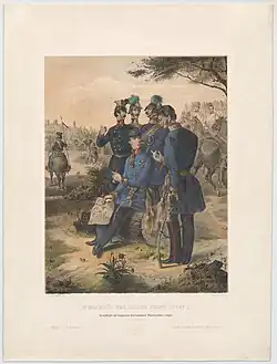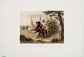 The imperial infantry relied on muzzleloaders; although the more-modern breechloaders were in use by the Prussian Army, the army commandant considered them inaccurate and wasteful of ammunition.[31] The infantry primarily used Augustin M 1842 muskets, with an effective range of 250 meters and 75-percent accuracy to 100 paces.[30] Another weapon used by the Austrian army was the 1842M kammerlader smoothbore rifled musket, which was more accurate and had a longer range than the M 1842. The light infantry was equipped with short-barrel hunting rifles, which were more accurate and reliable than the long-barrelled rifles also used.[30] The imperial cavalry used the 1844 M short, smooth-barrelled cavalry percussion carbine, which was effective to 50 paces. Although it used handguns in close combat, but its main weapons were swords and sabers.[30] Morale was high before the battle, due to Haynau's victories and the presence of young Franz Joseph I and the Archdukes Ferdinand Maximilian and Karl Ludwig in the camp.[30][32]