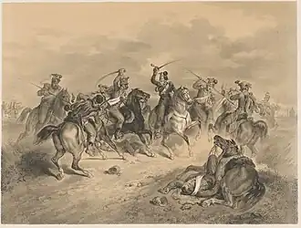 The Hungarian army was equipped with a variety of weapons (including hunting rifles and parade weapons), but the Austrian and Russian weapons were standardized for efficiency.[33] Although some Hungarian troops used modern percussion rifles, most had tube-lock rifles or flintlock pistols. The swords, primarily used by the hussars who made up nearly all the cavalry, were even more diverse. Some were modern, but many of the swords (or their blades) were remnants of the 16th- and 17th-century Turkish wars.[33]
