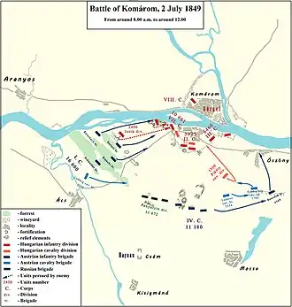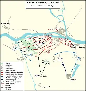 - ^ a b Bánlaky József: A magyar nemzet hadtörténete XXI, XXXII Az osztrák fősereg előnyomulásának folytatása; a komáromi első csata 1849. julius 2-án. Arcanum Adatbázis Kft. 2001