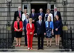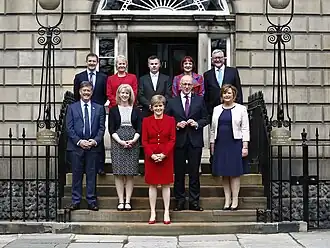 In the May 2016 Scottish Parliament election, the Scottish National Party (SNP) won 63 of the 129 seats contested. Incumbent First Minister Nicola Sturgeon soon afterwards announced her intention to form a minority government. She was nominated for the post of first minister by a vote of the Scottish Parliament on 17 May, defeating Scottish Liberal Democrat leader, Willie Rennie by 63 votes to 5, with 59 abstentions.[1] Ahead of the formation of the new government, long-serving ministers Alex Neil and Richard Lochhead announced their resignations from the cabinet.[3] Sturgeon recommended the appointment of James Wolffe as Lord Advocate and Alison Di Rollo as Solicitor General on 31 May 2016. Their recommendation was confirmed by the Scottish Parliament on the same day.[4]