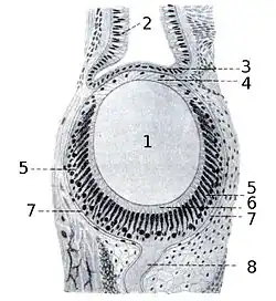 ![]() 1 - lens 2 - olfactory epithelium 3 - corneal epithelium 4 - corneal endothelium 5 - retina 6 - layer with rod cells 7 - fibrous connective tissue layer 8 - nerve of the eye |
