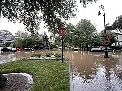 In Connecticut, heavy rainfall forced closures on numerous roads, including a sinkhole on U.S. Route 202 in New Milford and flooding on Connecticut Route 199 in Washington.[61] Several festivals were postponed, and multiple flood warnings were issued by the National Weather Service.[62][63] The Housatonic River swelled in western portions of the state,[64] and damage occurred across several towns in the state, including in New Hartford, Norwalk, and Torrington.[61] In Hartford, 4.07 inches (103 mm) of rain fell, which was the highest total across Connecticut and setting a daily rainfall record.[25][65]