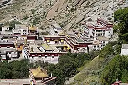 The hermitage complex faces south. It has several structures built along the west–east direction. The "yellow retreat hut" seen here was the main hermitage of Tsongkhapa’s (1357–1419). According to a local legend, the ‘local site-spirit’ (gzhi bdag) used to enter through a small window in this house to meet Tsonkhapa. A further legend is that a fresco of Tsongkhapa on the wall in the room is stated to be a speaking-statue, an “image that speaks” (gsung byon ma).[1][3]