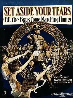 Set Aside Your Tears (Till the Boys Come Marching Home) is a World War I song written and composed by Wolfe Gilbert, Malvin Franklin, and Anatole Friedland.[1] The song was first published in 1917 by Jos. W. Stern & Co. in New York, NY. The sheet music cover depicts a woman waving to marching troops.[2]
