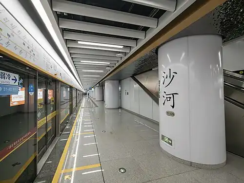 Shahe Station (Chinese: 沙河站; pinyin: Shāhé Zhàn; Cantonese Yale: Sāahǒ Jaahm) is an interchange station between Line 6 and Line 11 of the Guangzhou Metro. It started operations on 28 December 2024.[1][2] It is located underground at the northwest of the intersection of Xianlie Road East[3] and Guangzhou Avenue North[4] in Tianhe District.[5]