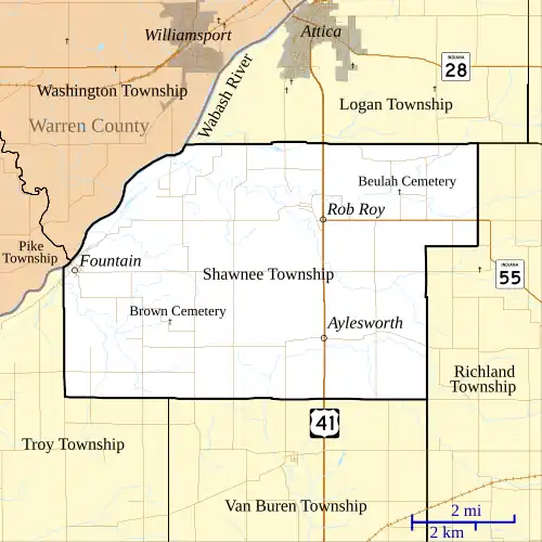 According to the 2010 census, the township has a total area of 34.82 square miles (90.2 km2), of which 34.67 square miles (89.8 km2) (or 99.57%) is land and 0.16 square miles (0.41 km2) (or 0.46%) is water.[3] It contains no incorporated settlements. The unincorporated communities of Aylesworth and Rob Roy both lie along the route of U.S. Route 41, while Fountain is in the far west on the east banks of the Wabash River. State Road 55 shares the route of U.S. 41 south from Attica until it reaches Rob Roy, at which point State Road 55 goes east while U.S. 41 continues south.