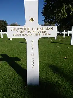Hallman joined the army from his birthplace of Spring City, Pennsylvania, in January 1943,[1] and by September 13, 1944, was serving as a staff sergeant in the 175th Infantry Regiment, 29th Infantry Division. On that day, in Brest, France, he single-handedly attacked and captured a German position, prompting the surrender of other German forces in the area. He was killed in action the next day and, on April 17, 1945, was posthumously awarded the Medal of Honor.