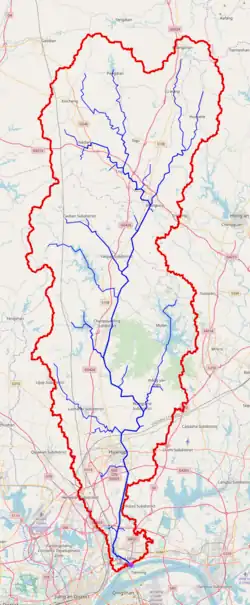 The headwaters of the She River flow from Mount Sanjiao ('Triangle Mountain')[1] in Dawu County, Hubei in Xiaogan. The river then travels east across Hong'an County in Huanggang, then entering the Huangpi District of Wuhan. Its watershed area is roughly rectangular in shape. On the lower reaches of the She River, there are several archaeological sites including the Masai archaeological site dating from the Warring States period, the Chengmentan archaeological site (New Stone Age), and the Sangujing archaeological site.[3]