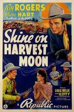 Shine On, Harvest Moon is a 1938 American Western film directed by Joseph Kane and starring Roy Rogers and Mary Hart. Written by Jack Natteford, the film is about a crazed outlaw who looks up a former partner, who has "gone straight", and tries to blackmail him with his past into resuming a life of crime. When this plan fails, the outlaw and his two psychopathic sons re-establish their gang and begin a wave of violence and rustling in the surrounding area, and arrange evidence that his former partner is the actual criminal. The partner's daughter engages the sympathy of Roy Rogers in bringing the truth to light and the real villains to justice. The supporting cast includes Stanley Andrews and William Farnum, and features Lulu Belle and Scotty in their only film appearance.[1]