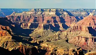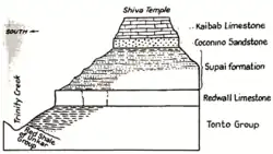 The top of Shiva Temple is composed of Permian Kaibab Limestone overlaying cream-colored, cliff-forming, Permian Coconino Sandstone.[11] The conspicuous band of sandstone, which is the third-youngest strata in the Grand Canyon, was deposited 265 million years ago as sand dunes. Below the Coconino Sandstone is slope-forming, reddish terraces of the Pennsylvanian-Permian Supai Group. Further down are strata of Mississippian Redwall Limestone, and finally the Cambrian Tonto Group.[12] Precipitation runoff from Shiva Temple drains south to the Colorado River via Trinity and Crystal Creeks.