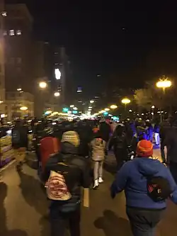 After the release of the video on November 24, 2015, a few hundred people blocked the intersection of Roosevelt and Michigan avenues in protest.[100] On November 25, 2015, more protests were held.[101] On the second night of protest, marchers tore off lights from a public Christmas tree in Daley Plaza and multiple marchers were arrested.[102]