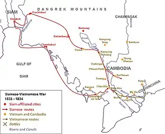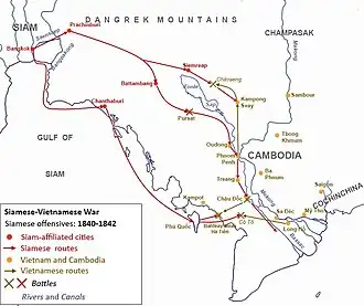 ![]() A map showing the movement of Vietnamese troops (from June to December 1845) during the Siamese-Vietnam War (1841–1845). | |||||||
