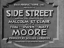 Side Street is a 1929 American Pre-Code film featuring the only screen teaming of all three Moore Brothers (Tom, Owen, and Matt), each of them major silent film stars. George Raft also makes an uncredited appearance as a professional dancer — which Raft was at the time — dancing to the song "Take a Look at Her Now", sung by June Clyde.[3] Side Street was directed by Malcolm St. Clair with a screenplay by George O'Hara and Jane Murfin, based on a story by St. Clair, which was adapted by John Russell.[1][4][5]