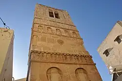 The north facade of the minaret is decorated with two rectangular commemorative plaques, contiguous just below the engraved calligraphy band. The right plate measures 49 cm high and 25 cm long, while the left, which is currently at risk of losing all its details, is 50 cm high and 25 cm long. The texts of nine lines each are written with a partially punctuated Tunisian style. Apart from these plates, the facades are richly decorated with moldings, serrations and architectural elements.[3]