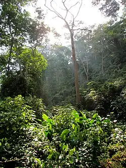 The vegetation in the park consists mainly of rainforest, cloud forests, highland moors and some sub-alpine and alpine tundra.[1] Typical species of trees include Anacardium excelsum, the wax palms Ceroxylon, Cecropia, Gyranthera caribensis, Tabebuia chrysantha, T. billbergii, T. chrysea and Podocarpus oleifolius, as well as countless herbaceous and flowering plants, epiphytic and vining aroids, ferns, mosses, lichens, carnivorous plants, tropical cacti and bromeliads.[5][6] Aquatic plant species are varied, as well, including Echinodorus,