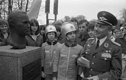 Sigmund Jähn in front of the bust of Yuri Gagarin in the Hain der Kosmonauten at the Archenhold Observatory, 1981