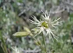 Silene oregana is a species of flowering plant in the family Caryophyllaceae known by the common names Oregon silene,[1] Oregon campion and Oregon catchfly. It is native to the western United States, including the Great Basin, where it grows in habitat such as sagebrush and forests. It is a perennial herb growing from a woody caudex and taproot, sending up an upright, mostly unbranched stem which may be 70 centimeters tall. The lance-shaped leaves are up to 8 centimeters long around the caudex, and shorter higher up the stem. Flowers occur in a terminal cyme and sometimes in leaf axils. Each flower is encapsulated in a hairy, glandular calyx of fused sepals. The five petals are creamy white or pink-tinged in color and each has four to six long, fringelike lobes at the tip.
