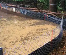Some government jurisdictions in the United States recommend or require the use of a reinforced fence, sometimes called a "super" silt fence or an enhanced silt fence, on some construction sites.[9] This design uses filter fabric reinforced by a wire mesh or chain link fence. The metal backing gives the fence increased strength to resist the weight of soil and water which may be trapped by the fence in a large drainage area, and discourages construction site operators from driving vehicles over the fence.[10] However, an improper installation of a super silt fence can create an inadvertent sediment basin when the filter fabric becomes clogged. This typically causes flooding and increased downstream pollution. Most super silt fence specifications are outdated, requiring the trenching installation method, which has been shown to be highly susceptible to "washing out" under the fabric due to improper back-filling and inadequate compaction.