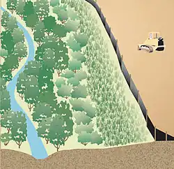 A typical fence consists of a piece of synthetic filter fabric (also called a geotextile) stretched between a series of wooden or metal fence stakes along a horizontal contour level. The stakes are installed on the downhill side of the fence, and the bottom edge of the fabric can be trenched into the soil and backfilled on the uphill side, although it is quite difficult to move the trenched "spoil" from the downside to the upside of the trench. The design/placement of the silt fence should create a pooling of runoff, which then allows sedimentation to occur. Water can seep through the silt fence fabric, but the fabric often becomes "blocked off" with fine soil particles (all sediment-retention devices have this challenge, and none of them "filter" storm water for very long). A few hours after a storm event, the fabric can be "disturbed" in order to dislodge the fines, and allow clean water to flow through. Depending on the protected watershed and erosion, larger soil particles will settle out, ultimately filling the silt fence to the top of the structure; requiring another silt fence above or below it (creating a new ponding area), or for the silt fence to be removed, the sediment removed or spread out, and a new fence installed. The fence is not designed to concentrate or channel stormwater. The fence is installed on a site before soil disturbance begins, and is placed down-slope from the disturbance area.[5][6]