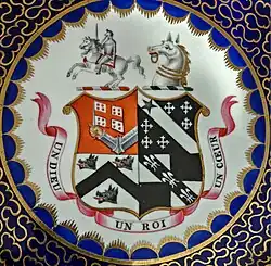 Sir Edward Lake died on 18 July 1674.[3][4] He died at Bishop Norton, Lincolnshire.[g] He was buried two days later in Lincoln Cathedral.[33] Edward's wife Anne had previously been buried in the cathedral. In the codicil to his will dated 8 June 1674, he wished to be buried as near to his wife in the cathedral as possible.[30] The burial was registered at the church of St Margaret In The Close, Lincoln.[34][35] A memorial to Sir Edward Lake was erected on a pillar near the west door of the cathedral.[58] This memorial was placed there by Sir Edward's nephew and heir, Thomas Lake. At some point before 1730, this monument fell into disrepair. The part of his monument exhibiting the arms, and crest of Sir Edward Lake survived. The remains of this were exhibited in a small chapel in Lincoln Cathedral, called Bishop Russell's chantry.[50] A few years before 1907, part of Edward's monument displaying his arms and crest, were fixed to the south wall of the cloister in Lincoln Cathedral. By this time it had broken in two pieces. The Latin inscription on the monument had been lost. But it was written down on paper, and was published in 1848, by Rev. S. Blois Turner, in the Lincoln volume of his book Proceedings Of The Archaeological Institute. On 11 April 1907 a tablet in marble with the original Latin inscription carved upon it was fixed below the remains of the arms and crest. It was erected by the Dean and Chapter, with descendants of Thomas Lake, and members of the Curtois families.[59]