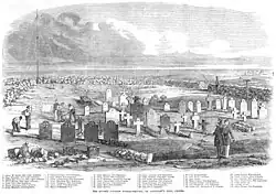On 7 June 1855 he was superseded by Lieutenant-General Henry Bentinck, and on hearing of the intended assault upon the Great Redan at Sebastopol he volunteered to lead the detachments of the 4th division to the attack.[5] On 18 June he displayed "a courage amounting to rashness" and after sending away his aides-de-camp, Captain Hume and Captain Snodgrass, the latter the son of the historian of his father's war, he rushed out of the trenches with a few followers, and fell at once in the act of cheering on his men.[5] Had he survived, Campbell would have been rewarded for his services in the winter, for in the London Gazette of 5 July it was announced that he would have been made a KCB.[5]