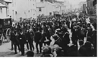 The Cockermouth electorate returned Lawson to parliament in the general election of 1895, where, with a slightly reduced majority he continued to prosecute his anti-war opinions. In 1898, he criticised the government, the Clergy, the newspaper editors and above all, public opinion after a command under General Kitchener slaughtered thousands of Dervish natives at the battle of Omdurman.[63] In 1896 he denounced the Jameson raid and sought answers to questions relating to the role played by the Colonial Secretary, Joseph Chamberlain.[64] When war came in the form of the Second Boer War, Lawson was unapologetic in his criticism of the British government's policy. He became a prominent Pro-Boer and a member of numerous anti-war organisations including the Stop the War Committee, the League of Liberals Against Aggression and Militarism, and the South Africa Conciliation Committee. On numerous occasions, he voted against, and spoke out against providing finance, sending men, ammunition and supplies, in the vain hope that with sufficient support he could bring down the government and so end the war.[65] However, all his efforts came to nothing and in return he became one of the few pro-Boer politicians to lose his parliamentary seat at the subsequent so-called Khaki election of 1900.