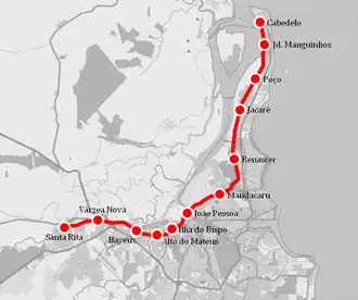 It currently consists of 12 stations on a single line of 30.03 kilometers, which interconnects the municipalities of Santa Rita, Paraíba, Bayeux, João Pessoa and Cabedelo, carrying an average of 11,600 passengers per day.