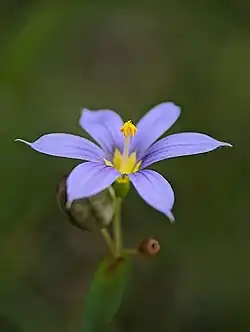 The species name, demissum, means humble.[5] In English the species is known by the common name "stiff blue-eyed grass".[8] As with many other species in its genus it is also simply called "blue-eyed grass".[6]