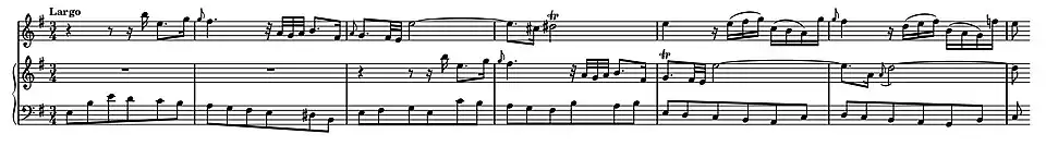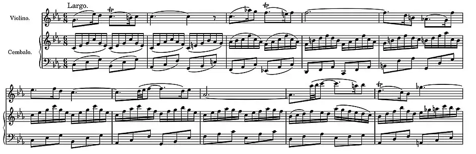 The Largo begins with a simple walking bass in the harpsichord which for the first three bars is annotated as a figured bass. The violin enters with the theme which is imitated in canon by the upper harpsichord part two bars later. The second complete statement of the theme is in the harpsichord with the canon in the violin, which passes into its "noble" lower register playing an expressive descending sequence of long sustained notes in suspension. It is during this passage that the third middle voice is first heard in the harpsichord playing semiquavers which dovetail with those of the main theme in the harpsichord, the combination of parts developing into a semiquaver accompaniment.