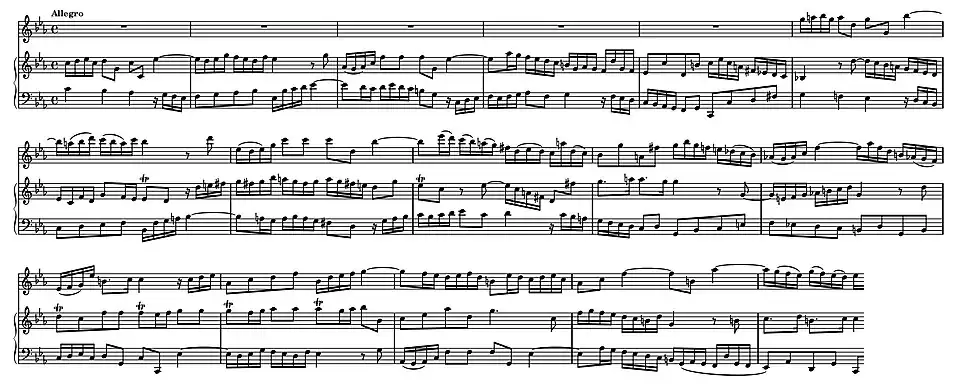 • Tutti fugue. Contrary to Eppstein's choice of name, these do not start off with a "tutti" section: they commence with the fugue subject in one of the upper parts (violin or right hand of the harpsichord), accompanied by a non-thematic accompaniment in the bass, which can be a bare bass line or a figured bass. The fugue subject is then taken up by the other upper part and finally in the bass. These movements have countersubjects, solo episodes, fugal development sections and a ritornello at the close.