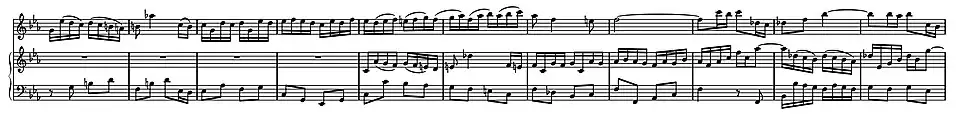 In the Adagio in triple time, the violin plays the cantabile melodic line in dotted rhythms in its lower and middle registers as if an alto solo. At first declamatory in the forte passages, the piano responses are expressive but subdued. Bach's knowledge of the expressive qualities of the violin is shown in the opening phrases, written so they can be played on the G string, the lowest string on the violin, regarded as having a "noble" tone. As Stowell (1990) explains, citing the opening of BWV 1017/3 as an example, the G string's "energy and powerful voice make it a whole instrument in itself and the lower this voice is, the more opportunity it gives to expression to attain the sublime." Around the violin melody, in the same registers, the right hand keyboard part weaves a dreamy accompaniment of broken chords in triplets. Below them the bass part punctuates the melody with a fragmented continuo-like accompaniment in quavers and crotchets. As Ledbetter (2002) comments, the complex and contrasting juxtaposition of rhythms, if played as annotated, has a magical effect. In the course of the movement there are six forte phrases of increasing complexity and length in the violin part each followed by a proportionate piano response. In the concluding four bar coda, the violin and harpsichord play semiquaver figures imitatively as the tonality modulates to G major, leading into the final Allegro. Eppstein (1966) describes the mood of the movement as "verinnerlichte und vergeistigte"—inward-looking and spiritual.[11]