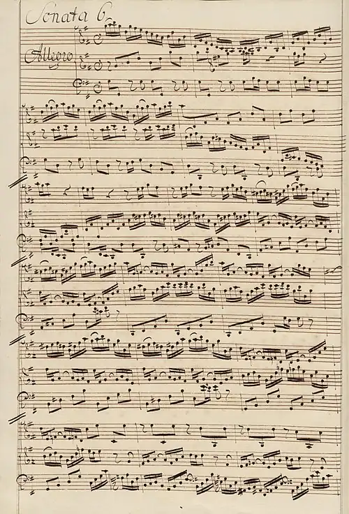 Although it had been believed for some time—and advanced as a theory by Eppstein (1966)—that the sonatas BWV 1014–1019 must have originated in lost trio sonatas for two instruments and continuo, no prior versions have been discovered and it is accepted that only a few movements could have such an origin. The first known source from 1725, in the handwriting of Bach's nephew Johann Heinrich Bach, explicitly specifies an obbligato harpsichord; and, despite the fact that a later version in the hand of Bach's pupil Johann Friedrich Agricola has a marginal "Violin I" at the start of BWV 1014, the scoring of the upper part in the keyboard, especially in the adagio movements BWV 1016/i, BWV 1017/iii and BWV 1018/iii, uses figures that are idiomatic to a keyboard instrument but unsuited to other instruments. Although this compositional style became widespread in the late eighteenth century, in Bach's day it was unusual and innovative. Although all the sonatas are written in trio sonata form, each has its own distinct character—the third is an example of the Sonate auf Concertenart, a sonata written in the style of a concerto.[4] Throughout his life Bach returned to the sonatas to refine and perfect the score, particularly in the last sonata, which survives in three different versions.[5]