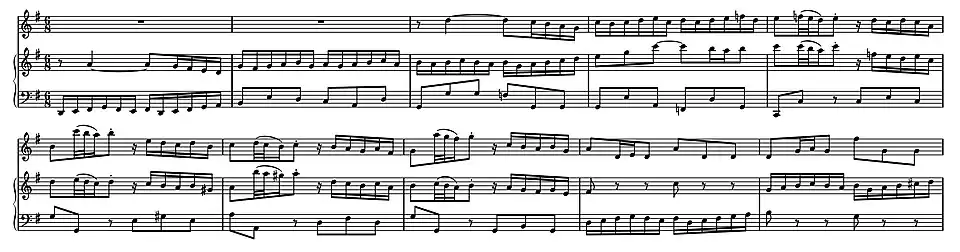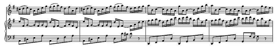 time, the third and central movement of BWV 1019 is an allegro in binary dance-form for solo harpsichord. Unlike the movements it replaced—the corrente and tempo di gavotta from the sixth keyboard partita, BWV 830—it cannot be identified with a particular dance. Although perhaps less brilliant than the sixth partita, the compositional style is comparable to Bach's keyboard writing of the 1730s that can be found in the binary preludes in Book 2 of the Well Tempered Clavier or some movements from the Overture in the French Style, BWV 831: the final piece in BWV 831 was also an unspecified dance movement with a similar function of showcasing the harpsichord. BWV 1019/3 is composed as a large scale movement with two and sometimes three voices. The semiquavers in the rhythmic theme are developed in extended passagework in both the upper and lower keyboard; after a development section and a recapitulation of the theme an octave lower, the second part concludes with semiquavers in parallel and contrary motion in both hands.[16]