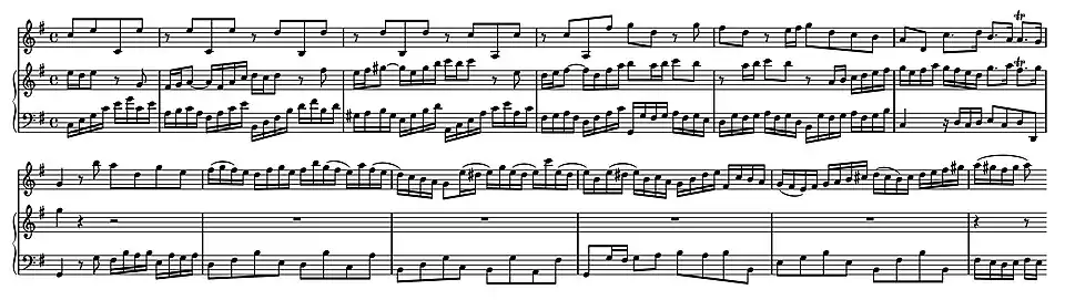As Watchorn remarks, these momentary interruptions are similar in effect to those in the last movement of the fourth Brandenburg Concerto BWV 1049. After further contrapuntal exchanges between all three parts the music draws to a second halt with a cadence in B minor. It then resumes with a complete recapitulation of the ritornello back in G major.[19]