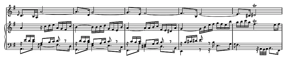 time is a Siciliano, a binary dance-form widely used in the early eighteenth century. In the minor key it was associated with a mood of melancholy or even pathos. The elegiac melodic line and ornamentation are entirely suited to the violin. As numerous commentators have pointed out, with its affecting anapaests, the compositional style and impassioned tone resemble those of the obbligato violin solo in the celebrated alto aria "Erbarme dich" from Bach's St Matthew Passion. The harpsichord supplies a continuo-like accompaniment. There are arpeggiated semiquaver figures in the harpsichord right hand, while the quavers in the left hand—with their French tenue slurs gradually descending in steps—provide a rhythmic pulse gently driving the movement forward, almost like an ostinato bass.[9]